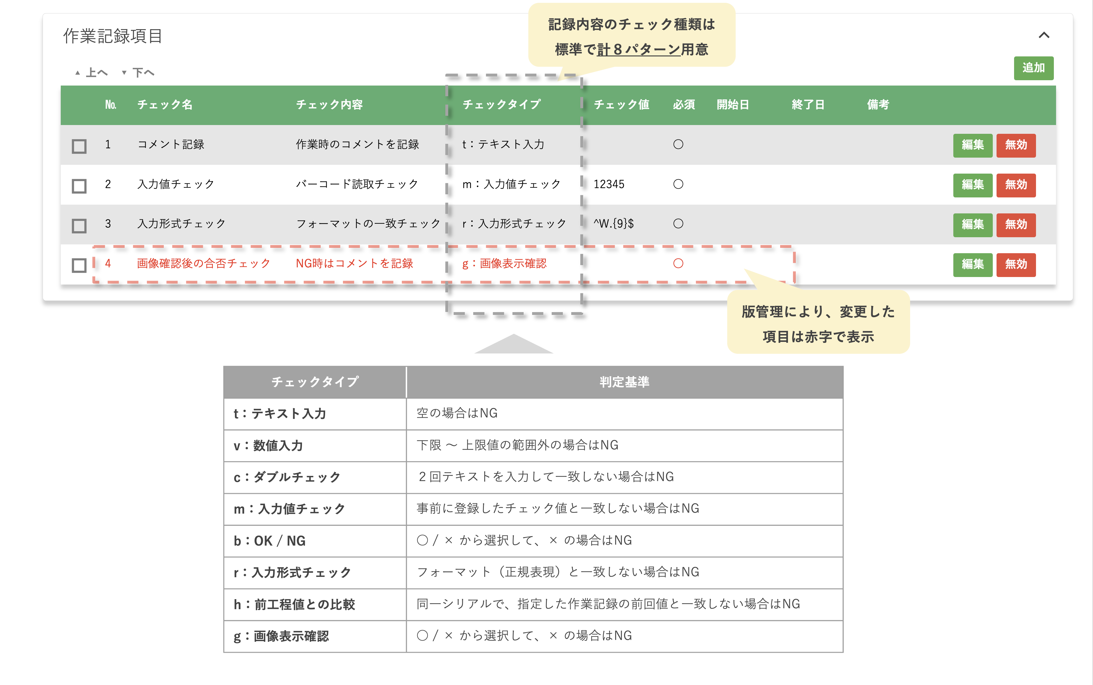 作業記録項目の登録画面では、作業書の指示通りの作業が実施されたかを、標準で8種類のチェック内容によって判定し記録していきます。チェック内容は画像中の通りです。また、作業記録項目に変更があった場合には、変更箇所を赤字で表示します。